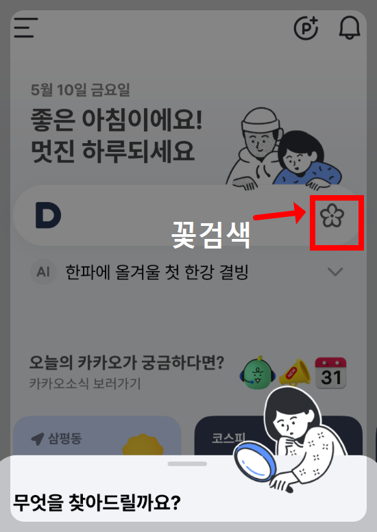 ํฌํ„ธ ์•ฑ์ธ ๋‹ค์Œ(Daum) ์•ฑ์—์„œ๋„ ‘๊ฝƒ๊ฒ€์ƒ‰’์ด๋ผ๋Š” ๊ธฐ๋Šฅ์„ ์ œ๊ณตํ•˜๊ณ  ์žˆ์Šต๋‹ˆ๋‹ค. ๋‹ค์Œ์•ฑ ๊ฒ€์ƒ‰์ฐฝ์—์„œ ๋งˆ์ดํฌ ๋ฒ„ํŠผ์„ ๋ˆ„๋ฅด๊ณ  ‘๊ฝƒ๊ฒ€์ƒ‰’์„ ์„ ํƒํ•œ ๋’ค ๊ฝƒ ์‚ฌ์ง„์„ ์ฐ์œผ๋ฉด, ์ž๋™์œผ๋กœ ์‹๋ฌผ ์ด๋ฆ„์„ ์ธ์‹ํ•˜์—ฌ ๊ด€๋ จ ์ •๋ณด๋ฅผ ์ œ๊ณตํ•ฉ๋‹ˆ๋‹ค.